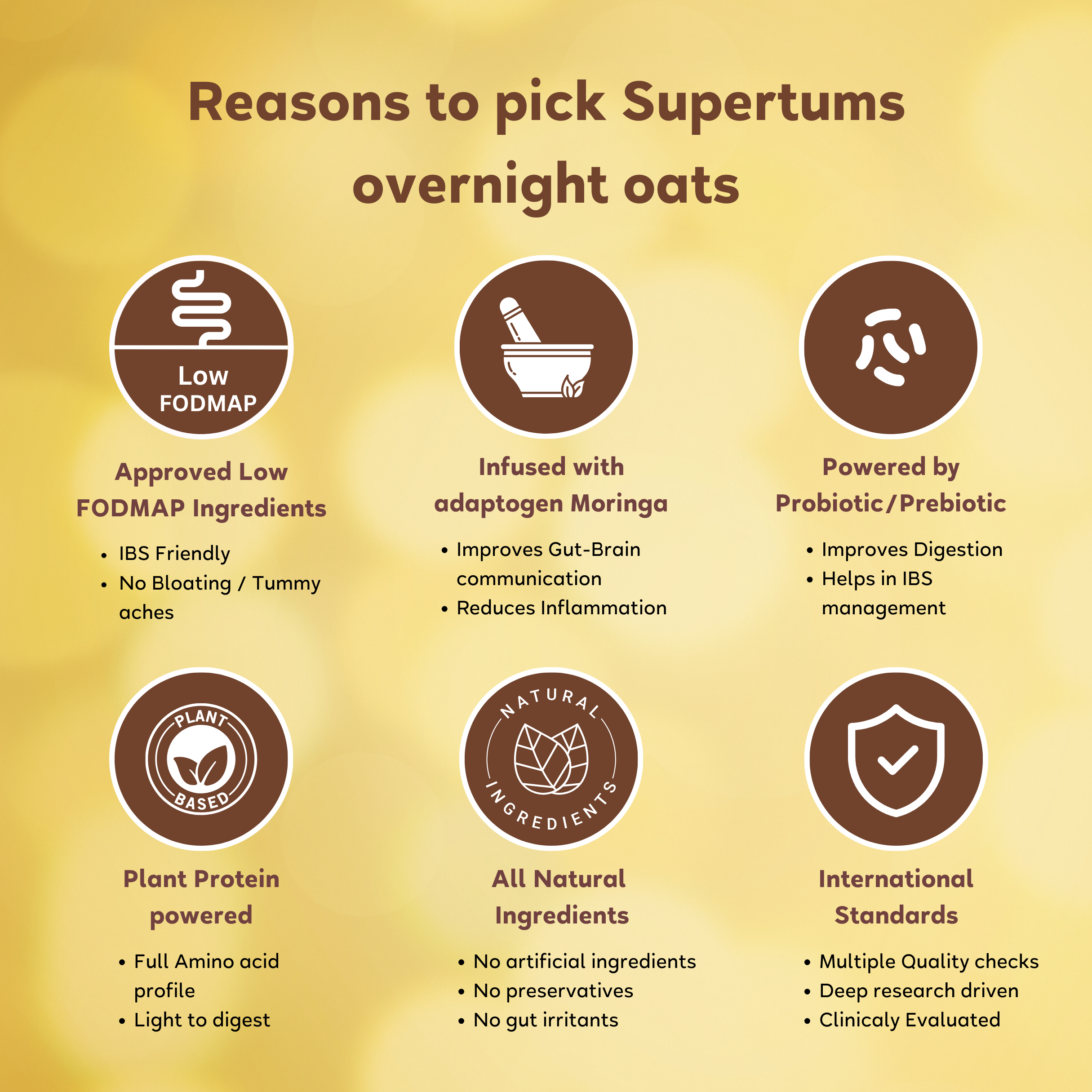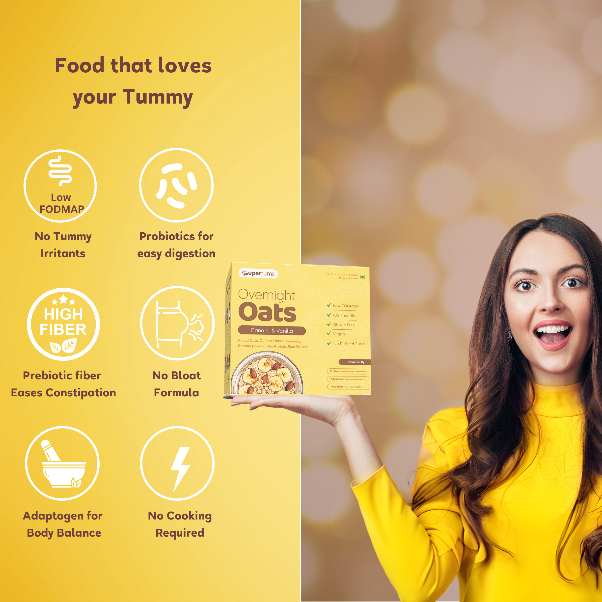 Supertums Banana Vanilla Overnight Oats is a Low Fodmap, gut-friendly, nourishing breakfast designed for sensitive stomachs. Made with real dried bananas, a touch of natural vanilla, and ancient grains and nuts/seeds, it delivers a creamy, comforting flavor while being gentle on digestion.